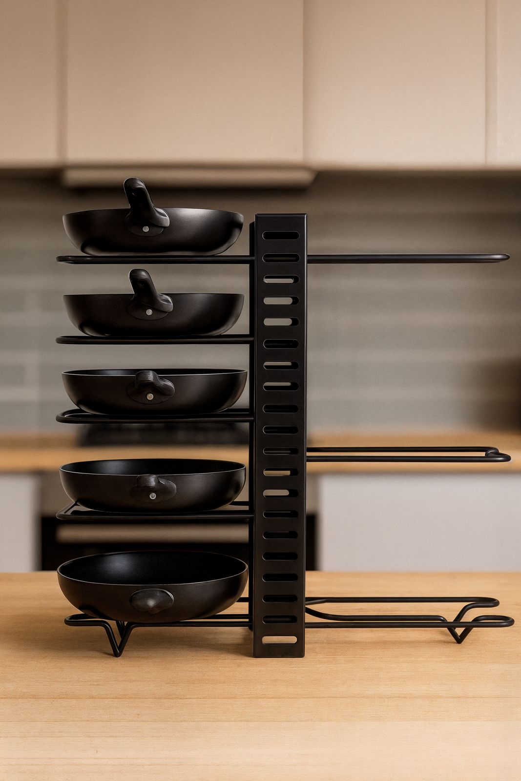 8-Tier Pot & Pan Organizer: End cabinet clutter in seconds. Tool-free setup; use upright, split, or flat. Non-slip arms lock pots and lids in place, supporting up to 20 kg for an instantly tidy kitchen.